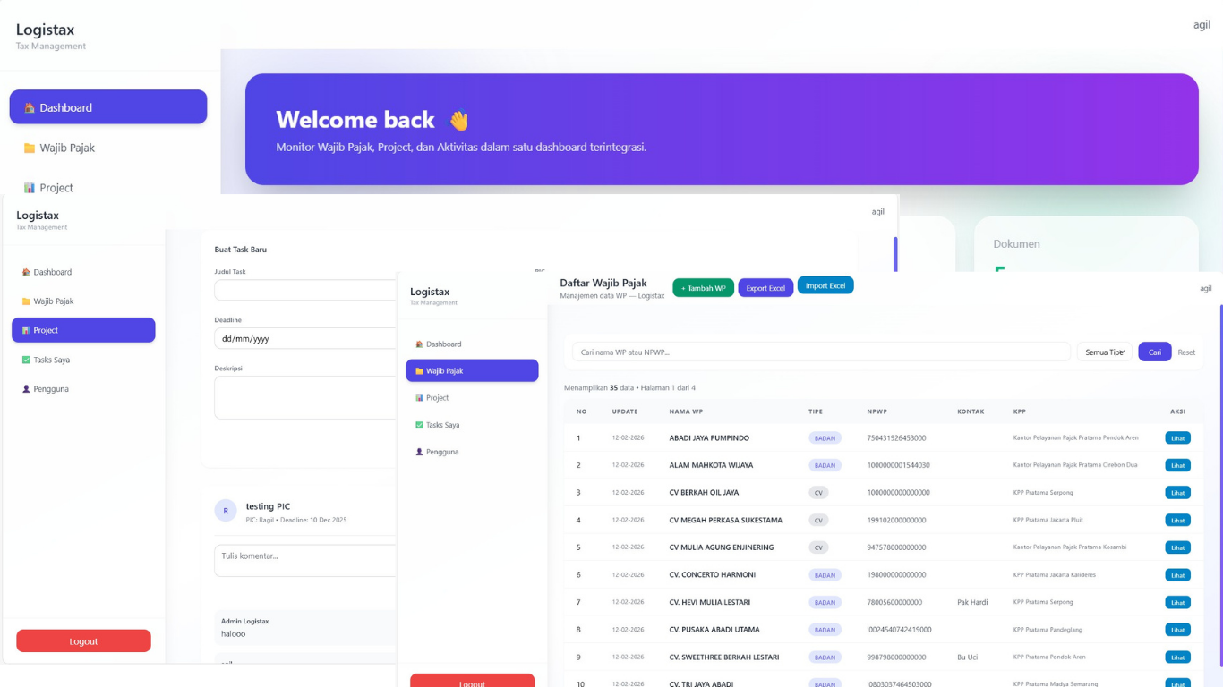 Platform profesional untuk mengelola wajib pajak, kontrak, dokumen, dan tim dalam satu dashboard yang aman dan elegan.